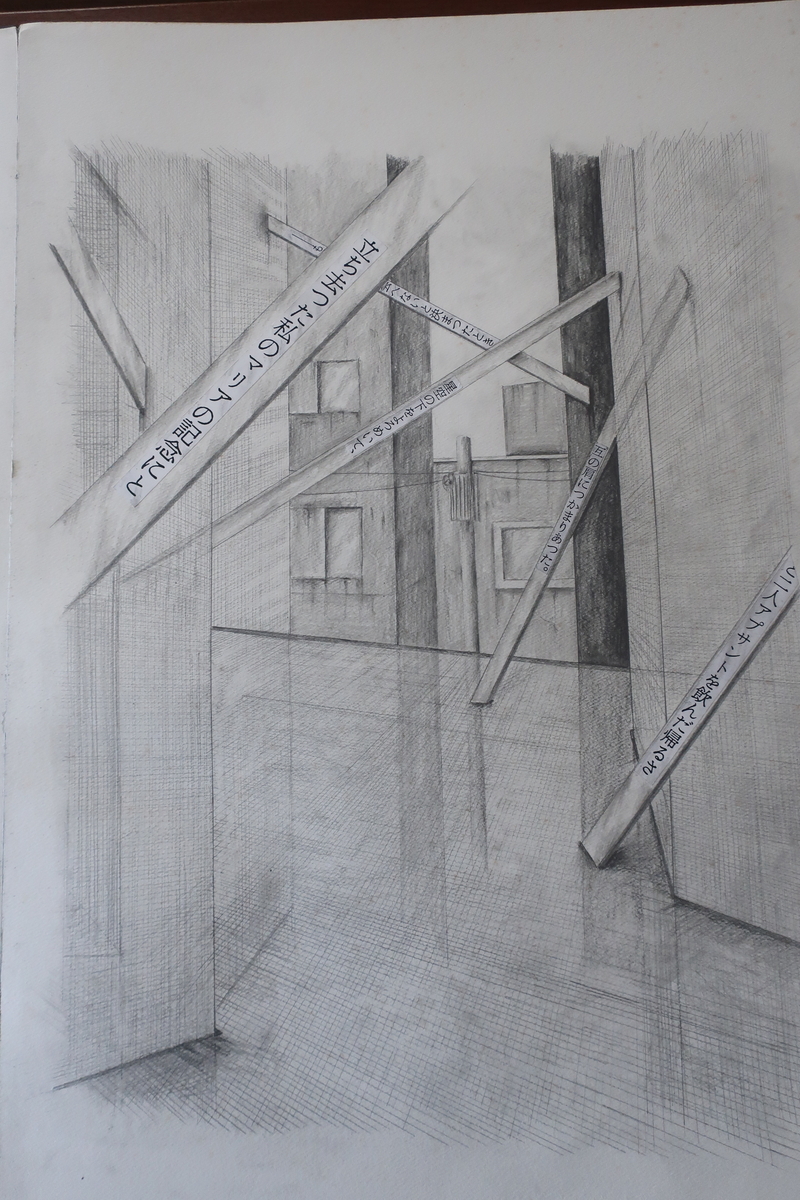 そんな課題に対してぼくが取り組んだのは、建物同志のスキマに縫って広がる、錆びついた鉄の造形物。この時点で早くも屈折してますね(笑) 富永太郎の詩そのものが退廃的であったことにも突き動かされ、建物の輪郭も判然としない造形物のなかに、仄かな光のような希望を見出せるのでないか、という、いかにも青臭い思い込み(!?)で課題に取り組んでいました。